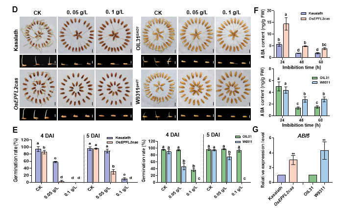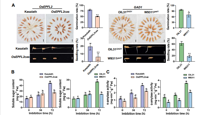 图1 GAD1和OsEPFL2参与调控种子萌发