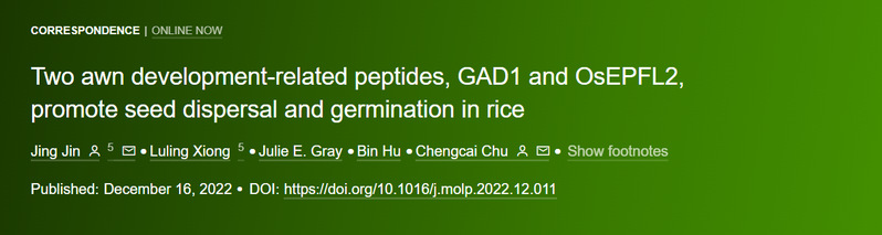 近日,乐竞在线注册农学院/岭南现代农业科学与技术广东省实验室作物资源高效团队在Molecular Plant在线发表了题为“Two awn development-related peptides, GAD1 and OsEPFL2, promote seed dispersal and germination in rice”的研究论文(链接: https://doi.org/10.1016/j.molp.2022.12.011)。文章探讨水稻芒和种子萌发间的关系,揭示了两个EPIDERMAL PATTERNING FACTOR/EPIDERMAL PATTERNING FACTOR-LIKE家族小肽在调控芒发育与影响水稻种子萌发中的双重功能。