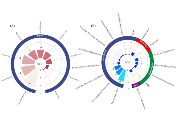 同时,NT显著改变了土壤细菌群落。随机森林模型表明,“降解/利用/同化Other”、“C1化合物同化”和“Amin和多胺降解”等土壤细菌代谢功能(基于MetaCyc预测),是与有机碳积累相关的最重要的土壤细菌潜在功能(图3和图4)。