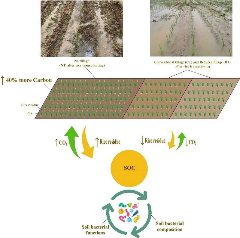 土壤有机碳与土壤肥力、作物产量和气候变化密切相关。稻田土壤有较高的固碳潜力,其有机碳含量比旱地土壤高约20%。保护性耕作是能够提高稻田土壤固碳的农田管理方式,前期有稻田保护性耕作研究发现,采用保护性耕作后前期(3-5年)土壤有机碳快速积累,此后土壤有机碳增速放缓并趋向于平衡,于是作者推测,在稻田保护性耕作的短期效应和长期效应下,土壤有机碳积累机制不同。因此,作者在中国南方稻田5年的短期保护性耕作定位试验取样,分析了常规耕作(CT),少耕(RT)和免耕(NT)三种耕作措施的土壤固碳效应,测定了水稻秸秆碳投入、土壤有机碳含量、CO2排放通量以及土壤细菌群落组成和功能预测,旨在明确短期稻田保护性耕作的固碳效果及其与土壤细菌的关系。