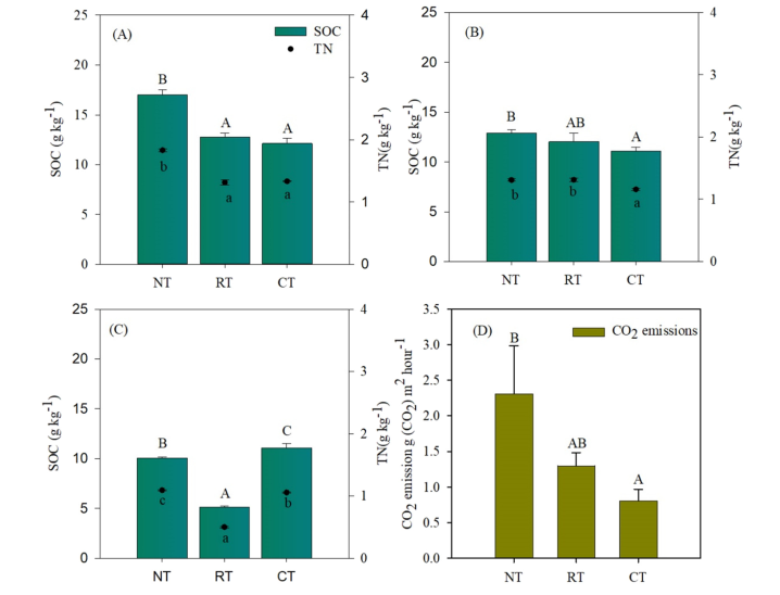 图1. 不同耕作措施对土壤有机碳、全氮和碳通量的影响