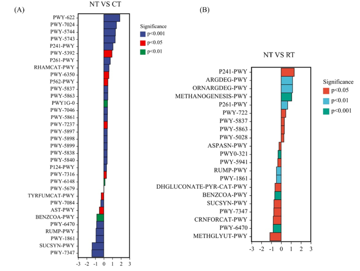 代谢途径差异分析表明,NT显著降低了benzcoa - py(厌氧芳香化合物降解)和ast-py (l-精氨酸降解II)。因此,稻田土壤有机碳的快速增加可能与土壤细菌调节的降解功能有关(图2)。