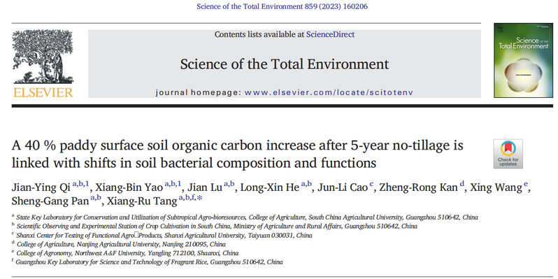 近日,Science of the Total Environment (影响因子10.753)在线发表了农学院唐湘如教授团队完成的题为“A 40 % paddy surface soil organic carbon increase after 5-year no-tillage is linked with shifts in soil bacterial composition and functions”的研究论文。(论文连接:https://www.sciencedirect.com/science/article/pii/S0048969722073065)。