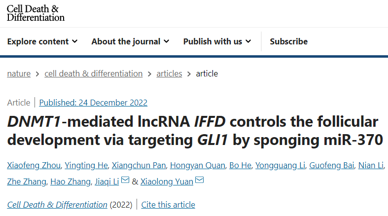 12月24日,乐竞在线注册动物科学学院李加琪/张哲教授团队以岭南现代农业科学与技术广东省实验室/广东省农业动物基因组和分子育种重点实验室为第一单位,在国际知名学术期刊Cell Death & Differentiation(中科院一区Top期刊,影响因子12.067)在线发表了题为“DNMT1-mediated lncRNA IFFD controls the follicular development via targeting GLI1 by sponging miR-370”的研究论文(论文链接:https://www.nature.com/articles/s41418-022-01103-y),发现了母猪卵泡成熟过程中新的lncRNA IFFD,揭示了lncRNA IFFD影响母猪性成熟的重要机制。