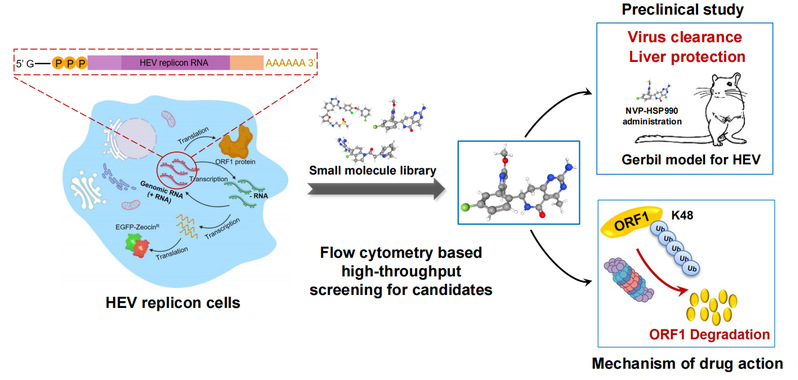 由于缺乏高效的HEV细胞培养系统和小鼠感染模型,HEV致病机制的研究和抗病毒药物研发严重滞后。自2015年开始,课题组陆续建立了可以稳定地表达HEV基因组、亚基因组RNA及GFP的基因3型 HEV复制子细胞系 ;同时还探究及优化了HEV腹腔注射沙鼠感染模型。在此基础上,课题组和合作团队利用HEV复制子细胞系对1000多种小分子化合物库进行高通量筛选,发现多种热休克蛋白90的抑制剂(iHSP90)均能高效地抑制HEV复制。后续数年的分子机制深入研究揭示HEV通过劫持宿主蛋白HSP90以维持其核心复制酶(replicase/ORF1)的蛋白稳态,这对病毒RNA的复制至关重要,并构成HEV独特的宿主-病原相互作用。使用HSP90的抑制剂靶向病毒ORF1-HSP90的相互作用导致ORF1与HSP90解离,促进ORF1发生K48型泛素化,从而介导ORF1的泛素蛋白酶体途径降解。同时,在HEV沙鼠感染模型的临床前研究发现,一种在体内靶向HSP90治疗肿瘤的二期临床试验药物能安全有效地抑制或清除基因3型或4型HEV的感染,其疗效显著优于广谱抗病毒药物利巴韦林,并且有效地缓解HEV感染造成的肝脏损伤。