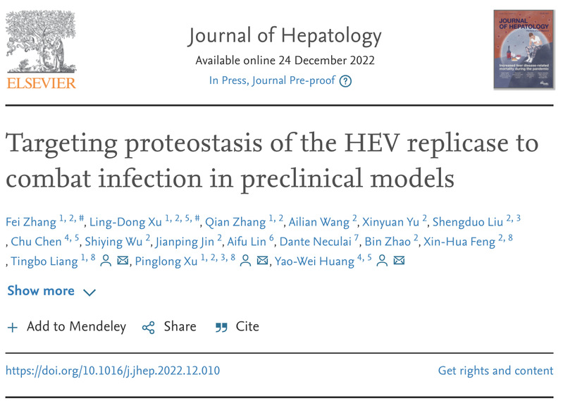 近日,乐竞在线注册、岭南现代农业科学与技术广东省实验室(简称岭南实验室)黄耀伟教授课题组,与浙江大学等单位合作,在肝病学领域顶级期刊Journal of Hepatology(影响因子30.1)上在线发表题为Targeting proteostasis of the HEV replicase to combat infection in preclinical models的研究工作(论文链接:https://www.sciencedirect.com/science/article/abs/pii/S0168827822034626),报道了靶向宿主-病毒互作抗戊型肝炎病毒(Hepatitis E virus,HEV)的新策略,解析了以HEV复制酶ORF1蛋白稳态为药物靶点的作用机制,并在课题组之前建立的HEV沙鼠感染模型中(Xu et al., Microbiology Spectrum, 2022)开展了系列药物的临床前试验,为人类及动物戊型肝炎的治疗提出了潜在的新疗法和分子靶标。