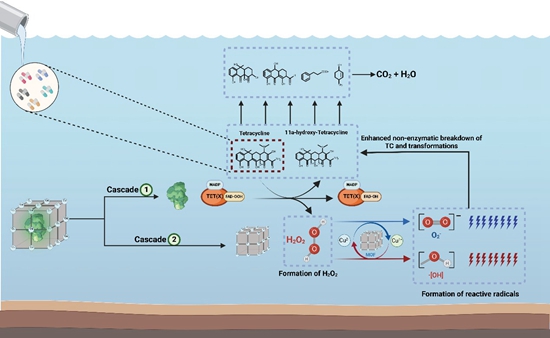 四环素类抗生素被广泛应用于临床诊疗与农业生产中,是所有抗生素种类中生产与消耗量最大的抗生素之一,其残留对生态安全与公共卫生体系会造成极大威胁,因此开发绿色高效的四环素残留净化技术具有重大的研究价值与应用前景。本研究首先针对团队前期研究中发现的新型四环素类抗生素降解酶TET(X)进行功能表征,发现其作为一种黄素单加氧酶能够在催化单加氧反应的同时通过分解FAD-OOH产生双氧水,基于这一特性,将其负载于一种铜基MOF,能够特异性地响应TET(X)产生的双氧水通过类芬顿催化产生活性氧协同TET(X)降解四环素。进一步的研究表征了新型复合催化体系TM响应四环素生成超氧根离子与羟基自由基等活性氧分子的水平,并研究了其在包括湖水、养殖废水、尿液及制药废水等环境水体中的四环素原位降解性能。使用响应面分析法发现了环境pH与环境温度对TM介导的四环素降解具有显著影响。这可能由于TET(X)介导的单加氧反应是启动TM级联催化的关键步骤,而作为一种酶,TET(X)的活性可能在一定程度上受到环境pH与温度的影响。最后研究还通过高分辨QTOF技术分析了TM降解四环素的中间产物,并据此推断了四条可能的降解路径。
