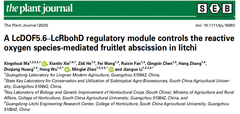 2023年1月,岭南现代农业科学与技术广东省实验室和乐竞在线注册亚热带农业生物资源保护与利用国家重点实验室、园艺学院李建国研究员团队在植物学国际主流学术期刊The Plant Journal(IF5Y=8.028)发表了题为“A LcDOF5.6-LcRbohD regulatory module controls the ROS-mediated fruitlet abscission in litchi”的研究论文(链接:https://onlinelibrary.wiley.com/doi/10.1111/tpj.16092),揭示了一个活性氧(ROS)的调控模块LcDOF5.6–LcRbohD,从而介导荔枝的幼果脱落。园艺学院李建国研究员、赵明磊副研究员和生命科学学院吴鸿教授为通讯作者,园艺学院博士后马兴帅和博士研究生谢仙林为共同第一作者。
