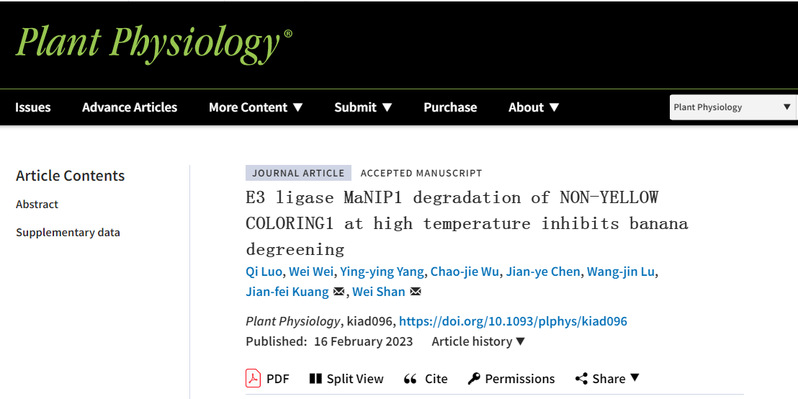 近日,乐竞在线注册园艺学院/广东省果蔬保鲜重点实验室陈建业和陆旺金教授团队在Plant Physiology发表了题为“E3 ligase MaNIP1 degradation of NON-YELLOW COLORING1 at high temperature inhibits banana degreening”的论文(在线网址:https://academic.oup.com/plphys/advance-article/doi/10.1093/plphys/kiad096/7041270),发现一个由E3泛素连接酶MaNIP1和叶绿素降解酶MaNYC1构成的调控香蕉果实青皮熟的作用模块。