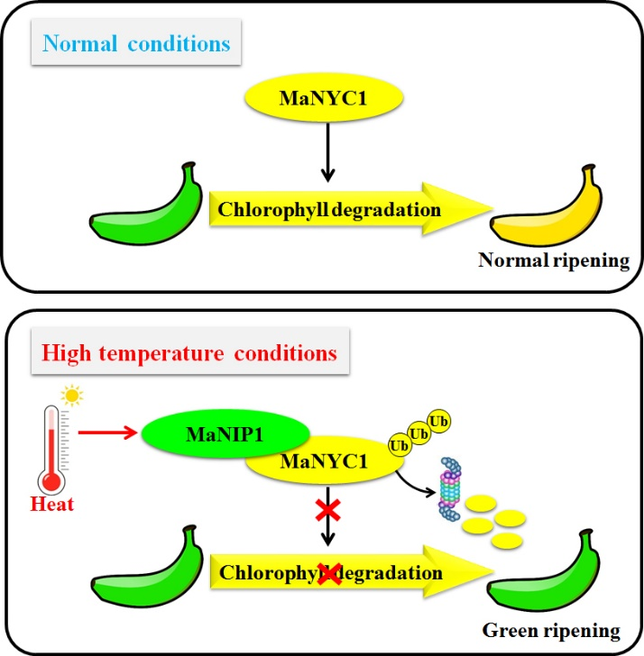 该研究首先通过蛋白定量组学分析全面筛选正常温度成熟和高温青皮熟香蕉果皮的差异蛋白,发现高温抑制叶绿素降解通路关键酶MaNYC1的蛋白积累。进一步蛋白互作和泛素化分析显示,E3泛素连接酶MaNIP1和MaNYC1互作,介导MaNYC1发生泛素化并通过蛋白酶体途径降解。更为重要的是,高温增强MaNIP对MaNYC1的降解作用,最终抑制MaNYC1介导的叶绿素降解,导致香蕉果皮不转黄(图1)。这些结果明确了MaNIP1-MaNYC1模块在香蕉青皮熟形成过程中的作用机制,丰富了高温影响果实品质形成的翻译后调控机制,也为生产实践上改善果品外观品质提供新的见解。