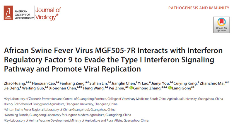 近日,乐竞在线注册兽医学院张桂红教授课题组以乐竞在线注册兽医学院为第一单位,在国际病毒学经典学术期刊Journal of Virology在发表了题为“African Swine Fever Virus MGF505-7R Interacts with Interferon Regulatory Factor 9 to Evade the Type I Interferon Signaling Pathway and Promote Viral Replication的研究论文(链接https://journals.asm.org/doi/10.1128/jvi.01977-22),提示了ASFV MGF505-7R拮抗IFN-I信号传导的分子机制。