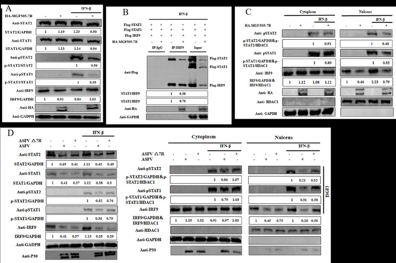 该研究发现MGF505-7R下调信号传导及转录激活蛋白1/2(Signal transducers and activators of transcription 1/2, STAT1/2)的磷酸化水平(图A),通过与干扰素刺激因子9(IFN-regulatory factor,IRF9)相互作用抑制ISGF3异源三聚体的形成,进而抑制ISGF3的核易位(图B和图C)。为了佐证MGF505-7R是ASFV免疫逃逸的关键蛋白,该研究利用同源重组技术构建了ASFV△MGF505-7R基因缺失毒株,与亲本毒株GZ201801相比,ASFV△MGF505-7R降低对STAT1/2蛋白的磷酸化水平及ISGF3核易位的抑制作用(图D)。
