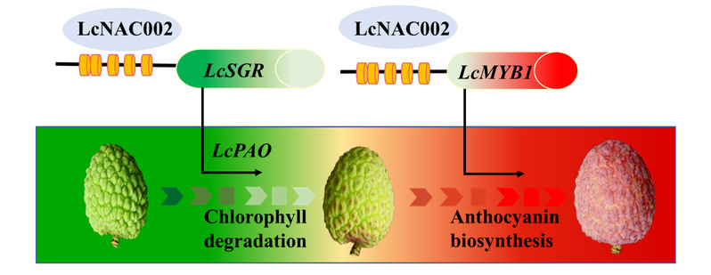 荔枝是华南特色果树,不同品种着色差异较大。‘妃子笑’成熟时叶绿素降解和花色苷积累缓慢,称为“滞绿型(stay- green)”品种;而‘糯米糍’成熟时叶绿素降解和花色苷积累快,果实呈现均匀的鲜红色。本研究通过‘妃子笑’和‘糯米糍’果实成熟时果皮转录组比较分析,筛选出‘糯米糍’高表达、‘妃子笑’低表达的转录因子LcNAC002。该基因瞬时表达烟草叶片,导致叶片快速黄化;VIGS沉默LcNAC002导致荔枝果实叶绿素降解和花色苷积累同步受到抑制。双荧光互补、酵母单杂、EMSA等实验结果表明LcNAC002能分别结合到叶绿素降解关键基因LcSGR和花色苷合成关键基因LcMYBY1的启动子上,并激活两个基因的表达。因此,LcNAC002 充当了荔枝果实成熟时叶绿素降解和花色苷积累调控路径的“交点”。
