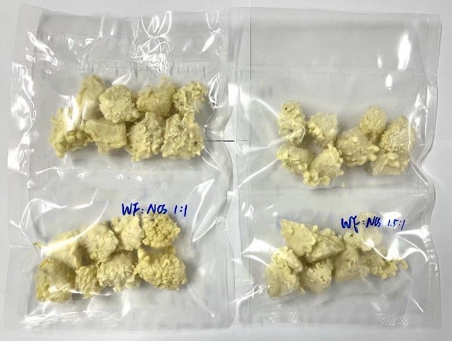 预裹粉的组成成分及比例极大地影响着油炸挂糊类产品的品质,基于此,课题组目前在探究新型天然辅料添加对裹粉面糊及基料品质的改善,并通过在裹粉中添加功能性营养成分,丰富裹粉的营养价值,改善裹粉的吸油率、脆性等。添加新型辅料所得到的预油炸杏鲍菇产品具有高水分含量和较低的含油量,多汁酥脆,味道鲜美且具有杏鲍菇爽滑脆嫩的口感,并且经冷冻储藏后复热仍能保持高水分含量和低油的特性,极大改善了传统裹粉和裹糊出现的吸油量大、裹粉易脱落等问题。所得到的预油炸产品经速冻和冻藏后,能够较好保持初炸产品的色、香、味、形,解冻后没有相互粘结现象。