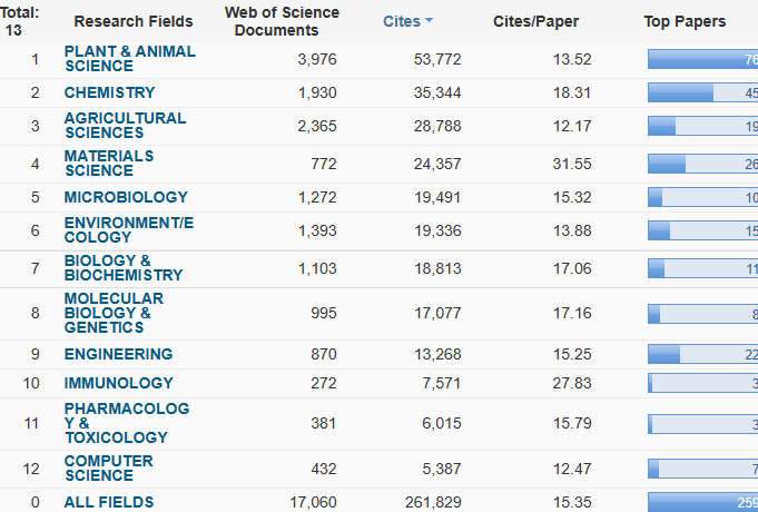 本期乐竞在线注册仍保持12个ESI学科进入全球前1%,无新增学科。12个学科与上一期相同,分别是:植物学与动物学、化学、农业科学、材料科学、微生物学、环境科学与生态学、生物学与生物化学、分子生物学与遗传学、工程学、免疫学、药理学与毒理学、计算机科学(依被引次数排序,图1)。