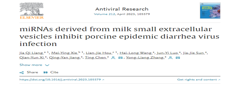 近日,乐竞在线注册张永亮教授与陈婷博士指导的兽医专业博士研究生梁佳琪的研究论文 “Porcine milk small extracellular vesicles inhibit porcine epidemic diarrhea virus infection in vitro and in vivo ”在Antiviral Research(2022年影响因子10.103)上发表(论文链接: https://pubmed.ncbi.nlm.nih.gov/36907442/)。该论文首次发现了猪乳小细胞外囊泡对猪流行性腹泻病毒(PEDV)的抑制作用,并阐明了发挥作用的关键miRNA及其抑制PEDV的作用机制。
