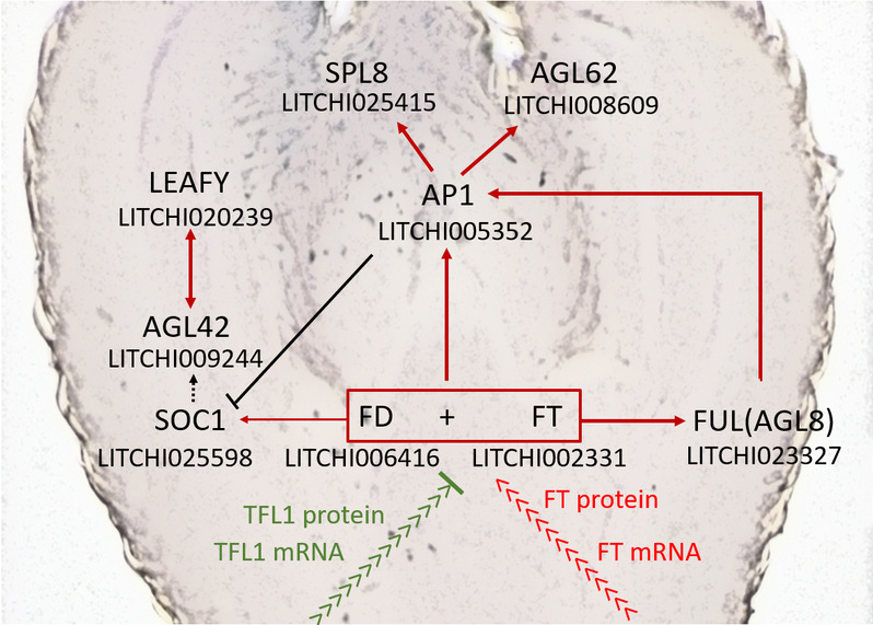 题为“SnRNA-seq and mRNA hybridization indicate key bud events and LcFT1 and LcTFL1-2 mRNA transportability during floral transition in litchi”(论文链接:https://doi.org/10.1093/jxb/erad103)的论文,针对植物芽成花调控网络复杂,普通的bulk RNA-seq面临取样困难的技术壁垒,迫切需要具有更高分辨率、更好的细胞类型分离技术来解析植物成芽花转变分子机制的问题,以荔枝成花过程中关键发育时期的三种不同状态的芽为研究对象,首次建立荔枝芽样本的单细胞核测序体系,完成了首例荔枝单细胞图谱构建,确定了芽成花决定的关键细胞群(只占芽样品的5%),成功规避了细胞异质性对研究的干扰。同时以核测序未检测到关键成花基因FT和TFL1表达,而qRT-PCR可明显检测到它们表达为切入点,利用原位杂交、RNA点杂交等技术,证明荔枝成花关键的基因LcFT1和LcTFL1-2可以以mRNA的形式从叶片转运至芽。在模式植物的基础上,绘制了荔枝芽成花转变的分子调控网络模型,为进一步的研究提供了关键的分子靶标。