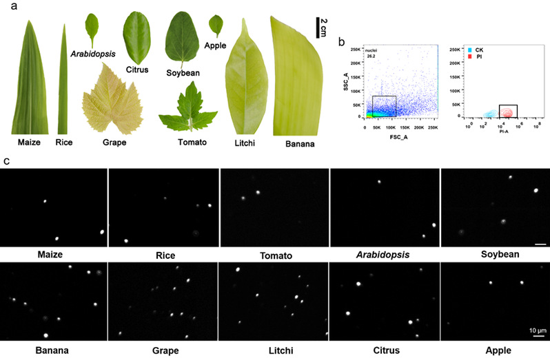题为“Systematic Methods for Isolating High Purity Nuclei from Ten Important Plants for Omics Interrogation”(论文链接:https://doi.org/10.3390/cells11233919)的论文,针对植物因为存在细胞壁和大量次生代谢产物,高质量原生质体难以获得,单细胞研究滞后于动物的问题,聚焦全球重要的十种经济作物,包括水稻、玉米番茄、大豆、苹果、葡萄、香蕉、柑橘和荔枝,开发了高效、高品质的植物核分离系统,成功克服了植物单细胞测序样本单细胞核分离困难、纯度低、得率少的难题,首次建立植物细胞核流式细胞仪绝对计数技术,同时实现细胞核的准确计数和回收分析。该论文是首例针对主要农作物高纯度细胞核详细的提取富集方法的报道,所分离纯化的细胞核的数量和纯度能满足细胞分裂周期和单细胞核测序研究的需要,研究结果将促进植物特别是木本植物单细胞水平的研究。