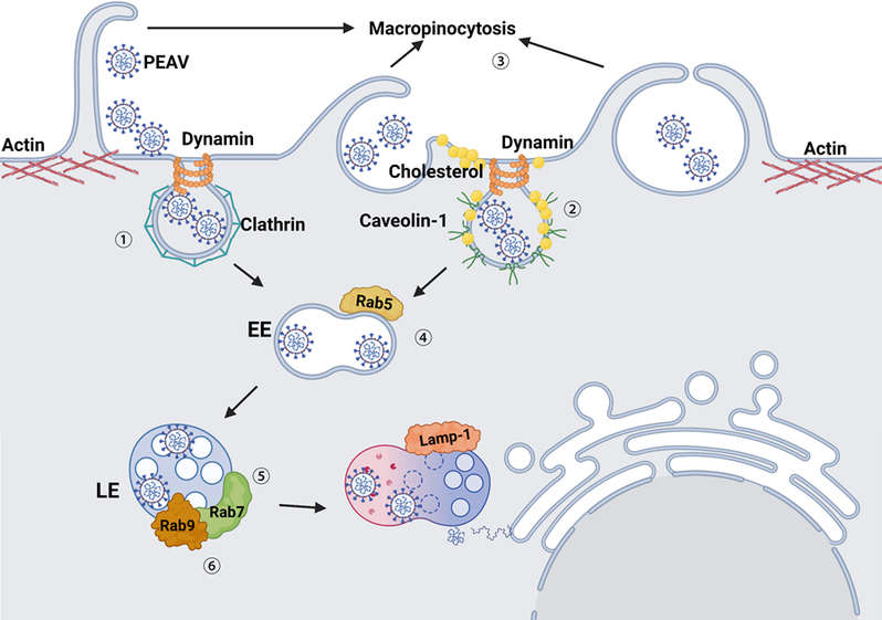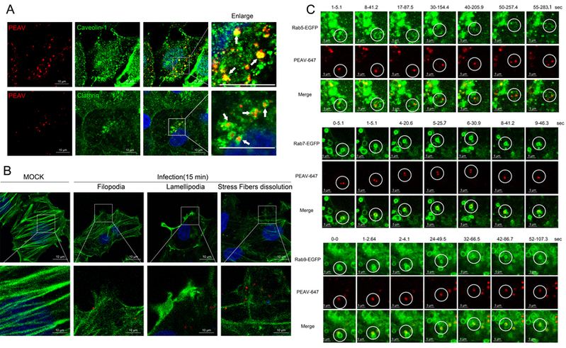 该研究发现PEAV通过膜穴样凹陷方式内吞,PEAV感染15 min后与小窝蛋白(caveolin-1)共定位,同时,感染15 min后也观察到PEAV定位于网格蛋白(clathrin)包被囊泡中(图A),说明PEAV可通过膜穴样凹陷和网格蛋白介导的两种内吞方式进入细胞,这与猪流行性腹泻病毒(PEDV)内吞方式是一致的。然而,PEAV可在多达21个细胞系中复制,包括人源、猴源、猪源、蝙蝠源和鼠源。鉴于PEAV的广泛宿主细胞嗜性,研究推测PEAV可能存在不依赖受体的内吞方式。进一步研究发现PEAV感染15 min即可激活巨胞饮,观察到肌动蛋白骨架重排(丝状伪足、步状伪足和应力纤维分解)等巨胞饮激活后的细胞形态变化(图B),提示PEAV也通过巨胞饮的内吞方式进入细胞。为了研究PEAV内吞后是否依赖Rab GTPases调控的内体转运过程,构建了调控早期内体运输的Rab5,调控晚期内体运输的Rab7,调控晚期内体运输至高尔基体的Rab9,调控内体循环的Rab11表达质粒,将PEAV进行荧光标记,通过活细胞工作站观察病毒在不同Rab蛋白包被囊泡中的动态转运现象。结果发现PEAV可在Rab5、Rab7、Rab9蛋白标记的囊泡中共同转运(图C),提示PEAV内体转运依赖Rab5、Rab7、Rab9调控。