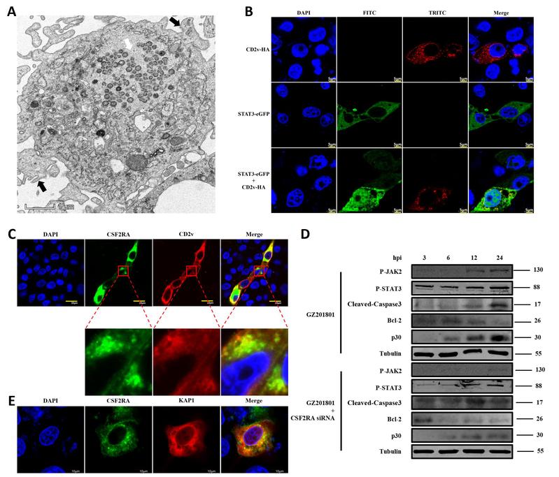 为探究ASFV调控JAK2-STAT3信号通路的具体分子机制,通过双荧光素酶报告系统筛选发现CD2v可显著激活STAT3的转录水平并促进其入核(图B)。构建重组ASFV-△CD2v缺失毒株可下调JAK2-STAT3信号通路,诱导细胞凋亡。酵母双杂交系统筛选发现病毒蛋白CD2v与宿主蛋白CSF2RA互作(图C),CSF2RA是存在于髓系细胞中造血受体超家族成员,具有上调JAK2和STAT3蛋白表达水平的功能。研究表明,干扰CSF2RA可显著下调JAK2-STAT3信号通路促进细胞凋亡抑制ASFV复制(图D),CSF2RA与STAT3的转录负调控因子KAP1互作(图E),从而调控STAT3的入核水平。