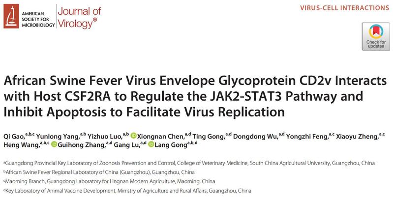近日,乐竞在线注册兽医学院重大动物疫病防控团队张桂红/龚浪课题组在国际病毒学权威杂志Journal of Virology在线发表题为“African Swine Fever Virus Envelope Glycoprotein CD2v Interacts with Host CSF2RA to Regulate the JAK2-STAT3 Pathway and Inhibit Apoptosis to Facilitate Virus Replication”的文章(链接:https://journals.asm.org/doi/10.1128/jvi.01889-22),发现ASFV CD2v与宿主蛋白CSF2RA互作,激活JAK2-STAT3信号通路,并抑制宿主细胞凋亡,从而有利于ASFV复制的分子机制。