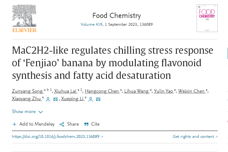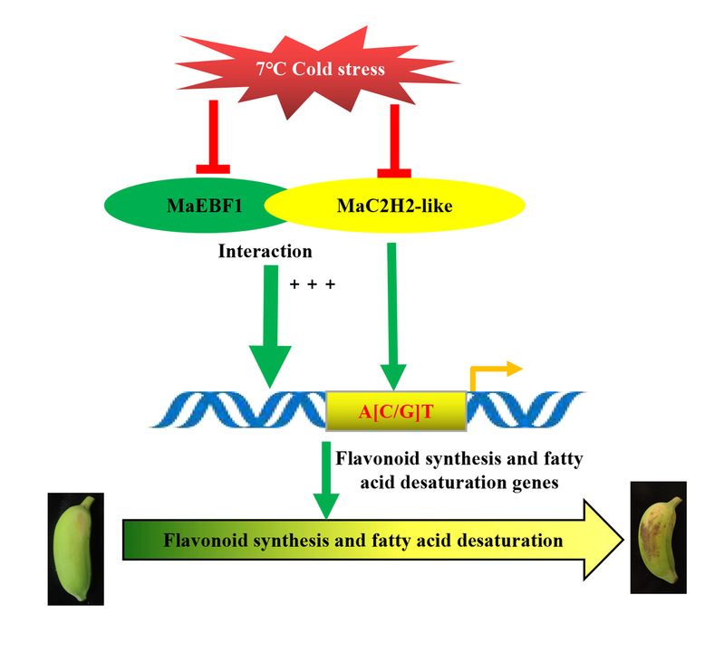 2023年3月31日园艺学院李雪萍课题组在Food Chemistry(农林科学1区Top,影响因子9.231)上发表了题为“MaC2H2-like regulates chilling stress response of ‘Fenjiao’ banana by modulating flvonoid synthesis and fatty acid desaturation”的论文。该研究揭示了转录因子MaC2H2-like调控低温胁迫引起粉蕉果实冷害的分子机制,为粉蕉果实的贮藏保鲜提供理论依据。课题组前期的研究发现,粉蕉MaC2H2-like和MaEBF1互作,促进果实淀粉和细胞壁降解,参与果实成熟调控(Lai et al., 2022)。在本研究中,研究者进一步发现粉蕉MaC2H2-like正调控2个脂肪酸去饱和基因(MaFAD6-2和MaFAD6-3)和4个类黄酮合成基因(MaC4H-like1、Ma4CL-like1、MaFLS和MaFLS3),缓解粉蕉果实冷害症状。MaEBF1与MaC2H2-like蛋白互作增强MaC2H2-like对脂肪酸去饱和及类黄酮合成基因的调控。MaC2H2-like粉蕉瞬时超表达诱导粉蕉果实抗寒性,MaC2H2-like粉蕉瞬时沉默表达降低粉蕉果实抗寒性。该研究阐明了MaC2H2-like调控粉蕉果实冷害的作用机制。乐竞在线注册宋遵阳博士后(现山东农业大学食品科学与工程学院副教授)和园艺学院硕士毕业生赖秀华为该论文第一作者,园艺学院李雪萍教授和朱孝扬副研究员为通讯作者,陈维信教授参与了该研究。该研究得到了国家香蕉产业体系、国家重点研发项目、国家自然科学基金、广东省香蕉菠萝产业体系和珠江人才计划的资助。