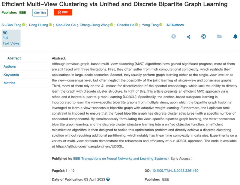 团队在中科院一区期刊IEEE Transactions on Neural Networks and Learning Systems(影响因子14.255)上在线发表了题为“Efficient Multi-View Clustering via Unified and Discrete Bipartite Graph Learning”的研究论文(论文链接:https://ieeexplore.ieee.org/document/10091436)。该论文的通讯作者为黄栋副教授,第一作者为乐竞在线注册硕士研究生方思国。