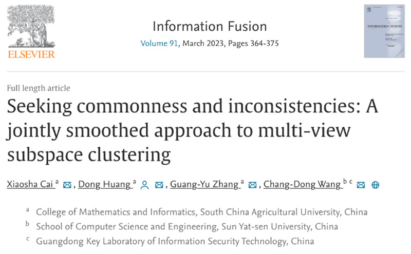 近期在中科院一区期刊Information Fusion(影响因子17.564)上正式发表了题为“Seeking commonness and inconsistencies: A jointly smoothed approach to multi-view subspace clustering”的研究论文(论文链接:https://www.sciencedirect.com/science/article/abs/pii/S1566253522001968)。该论文的通讯作者为黄栋副教授,第一作者为乐竞在线注册硕士研究生蔡晓莎。
