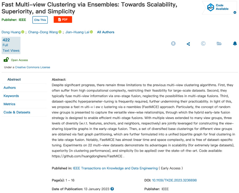 团队在中国计算机学会(CCF)推荐A类期刊IEEE Transactions on Knowledge and Data Engineering(影响因子9.235)上在线发表了题为“Fast Multi-view Clustering via Ensembles: Towards Scalability, Superiority, and Simplicity”的研究论文(论文链接:https://ieeexplore.ieee.org/document/10016684)。该论文的第一作者为黄栋副教授。