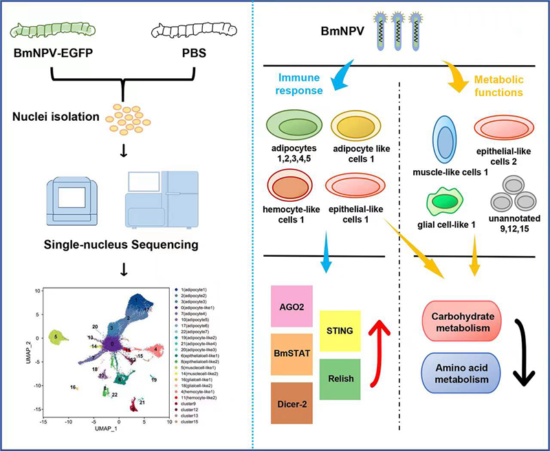 该研究首次系统揭示了昆虫脂肪体细胞的多样性,为深入研究脂肪体各细胞类型对病毒感染的响应提供了基因表达谱资源,并为阐明BmNPV与宿主互作机制提供理论基础。