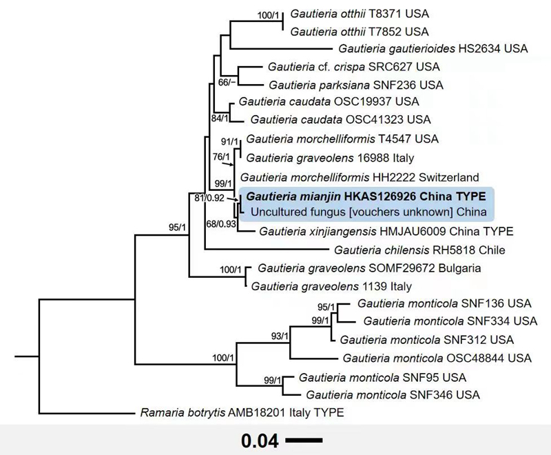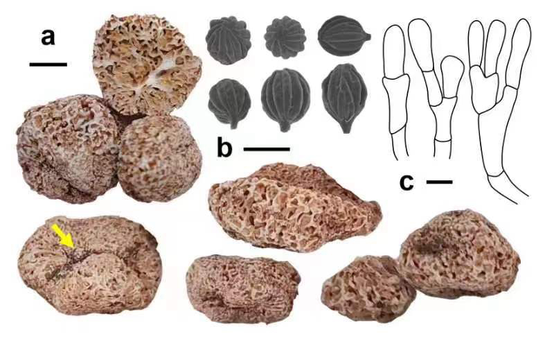 形态学上,面筋高腹菌的核心特征包括:担子果不规则近球状,直径2.5–5 cm;产孢组织脑状至蜂窝状;担孢子近球形至宽椭圆形,11–14×10–12 μm,具10–14条纵棱。其封闭成脑状至蜂窝状的产孢组织本质上由众多开放的珊瑚状分枝折叠收缩而成,通过缩小表面积减缓了在干旱环境中的水分散失,可能是对干旱环境适应性进化的结果。而其细胞壁加厚、具纵棱的孢子,可能能延长在动物消化道内驻留的时间并保持生活力,可能是对其孢子传媒(如小型啮齿动物)适应性进化的结果。系统学上,本研究中基于细胞核核糖体DNA内转录间隔区(nrITS)序列构建的分子系统发育树显示,面筋高腹菌与同属部分来自欧洲和北美的分类群,如羊肚状高腹菌(G. morchelliformis)密切近缘。它们可能曾有一个广布于北半球的共祖大种群,在晚中新世青藏高原快速隆升和特提斯海退缩导致干旱加剧后,逐渐发生地理隔离和异域成种,最终在北美、欧洲和东亚分化成多个密切相关的物种。在获得更多数据后,有关它们的起源、辐射和多样化的确切过程可以通过分子钟来揭示。