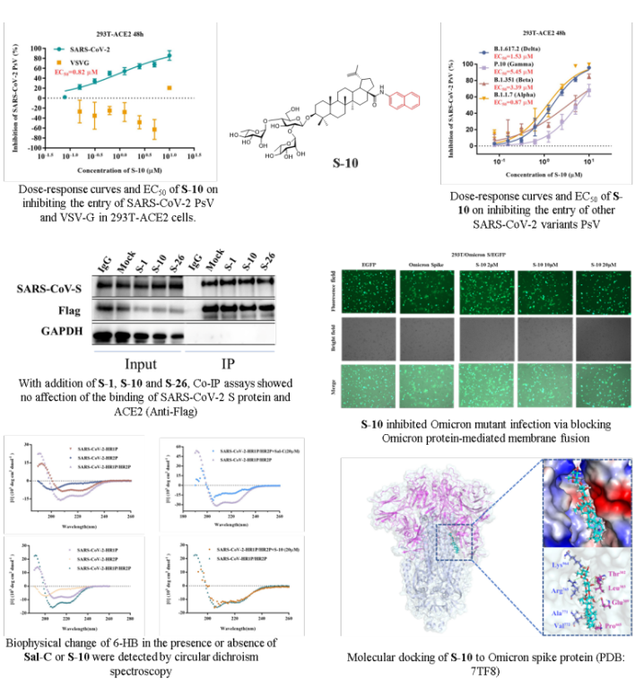 研究具有新颖作用机制的广谱抗病毒药物,对于应对SARS-CoV-2病毒的不断变异与传播有重要的意义。宋高鹏副教授联合南方医科大学刘叔文教授团队等综合利用假病毒模型、细胞-细胞融合、分子对接以及定点突变等实验,发现位于新冠病毒的刺突蛋白S表面的S1/S2亚基交界处富含“L-T-G”该特征氨基酸酸序列的结合空腔是潜在的调控新冠病毒感染和膜融合所必需的保守功能域,其氨基酸序列在Omicron等变异毒株中均高度保守。因此S蛋白表面的该结合空腔可作为开发小分子新冠病毒进入抑制剂的重要靶点。该研究团队以桦木酸BA为hit,运用多位点结合策略以及活性亚结构的拼合原理等药物设计的基本方法,对BA进行基于靶标结构和多样性导向的结构修饰,经过多轮的hit-to-lead等结构优化发现了一类基于马铃薯三糖桦木酸酰胺衍生物为结构骨架的新型小分子SARS-CoV-2融合抑制剂,并获得了先导化合物S-10。本研究利用假病毒感染、表面等离子共振SPR试验、免疫共沉淀实验、细胞-细胞融合实验、圆二谱实验、分子对接、定点突变实验等阐明S-10等桦木酸衍生物能够嵌入位于S蛋白表面的S1/S2交界处的富含“L-T-G”特征氨基酸序列的一个新的结合空腔,稳定了S蛋白的融合前构象,进而破坏了S蛋白的解离、融合、入侵的过程,从而发挥了广谱的抗新冠病毒作用。在初步成药性评价中,发现先导化合物S-10具有较高的体外代谢稳定性和较低的细胞毒性,是具有广阔开发前景的抗新冠病毒候选药物。该研究为开发新型的小分子新冠病毒融合抑制剂奠定了重要基础。