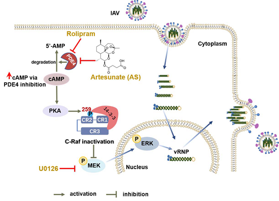 青蒿素是屠呦呦等中国科学家从菊科植物黄花蒿中分离得到的具有抗疟活性的倍半萜内酯化合物,其衍生物双氢青蒿素和青蒿琥酯(AS)等青蒿素类药物是世卫组织推荐的一线抗疟药物。课题组通过病毒感染细胞模型发现青蒿素类抗疟药物青蒿素、蒿甲醚、双氢青蒿素以及AS在A549和MDCK细胞中具有显著抑制IAV增殖作用,其中AS的抑制作用最强(EC50:7.93μM和7.56μM)。进一步通过作用机制研究发现,AS通过抑制磷酸二酯酶4(0PDE4)的活性升高细胞内第二信使环磷酸腺苷(cAMP)的水平,使C-Raf中Ser-259位点磷酸化导致C-Raf失活从而抑制其下游的ERK磷酸化,最终导致病毒核糖核蛋白复合物(Ribonucleoprotein complex,vRNP)核输出受阻,抑制病毒的复制。