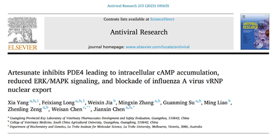 近日,乐竞在线注册兽医学院药理团队陈建新研究员课题组在国际病毒学经典期刊Antiviral Research(影响因子10.1)上在线发表了题为“Artesunate inhibits PDE4 leading to intracellular cAMP accumulation, reduced ERK/MAPK signaling, and blockade of influenza A virus vRNP nuclear export”的研究论文(论文链接:https://doi.org/10.1016/j.antiviral.2023.105635)。该研究发现抗疟药物青蒿琥酯(Artesunate,AS)在细胞上对不同亚型甲型流感病毒(Influenza A virus, IAV)的复制具有显著活性抑制,对感染IAV小鼠具有显著保护作用,并揭示AS通过调控PDE4/cAMP/ERK信号通路抑制IAV复制的作用机制。