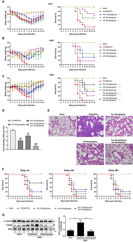 课题组还通过体内药效评价确定腹腔注射AS显著提高H1N1和H5N1感染小鼠的存活率(对H1N1感染:AS给药组60% VS 病毒对照组10%;对H5N1感染:AS给药组33.3% VS 病毒对照组0.0%;),并且在H5N1感染后延迟24 h给药,AS和帕拉米韦联合用药,显著提高感染小鼠的存活率。