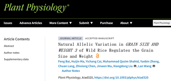 近日,乐竞在线注册农学院刘向东/王兰团队在水稻粒型研究方面取得新进展,在中科院一区TOP期刊Plant Physiology (影响因子8.005)发表了题为“Natural Allelic Variation in GRAIN SIZE AND WEIGHT 3 of Wild Rice Regulates the Grain Size and Weight”的研究论文(论文链接:https://doi.org/10.1093/plphys/kiad320)。