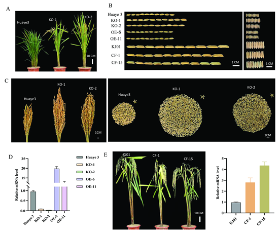 的单株产量分析;D. 敲除突变体和过量表达突变体的RNA表达水平分析;E. 互补转化体的表型及RNA表达量分析。