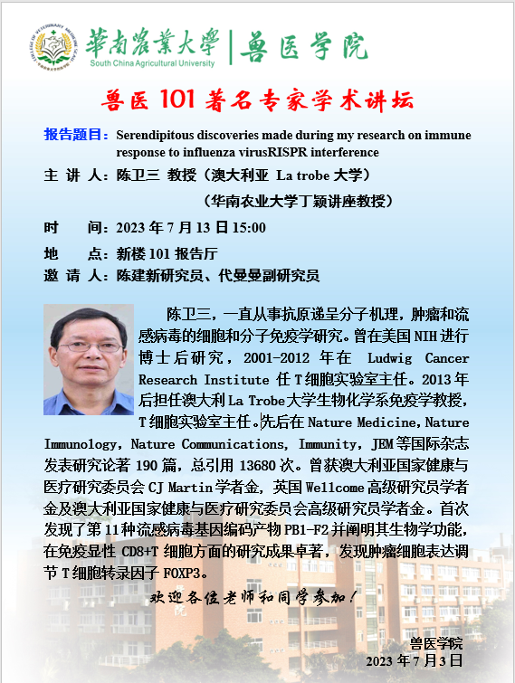 兽医101著名专家学术讲坛-- Serendipitous discoveries made during my research on immuneresponse to influenza virusRISPR interference