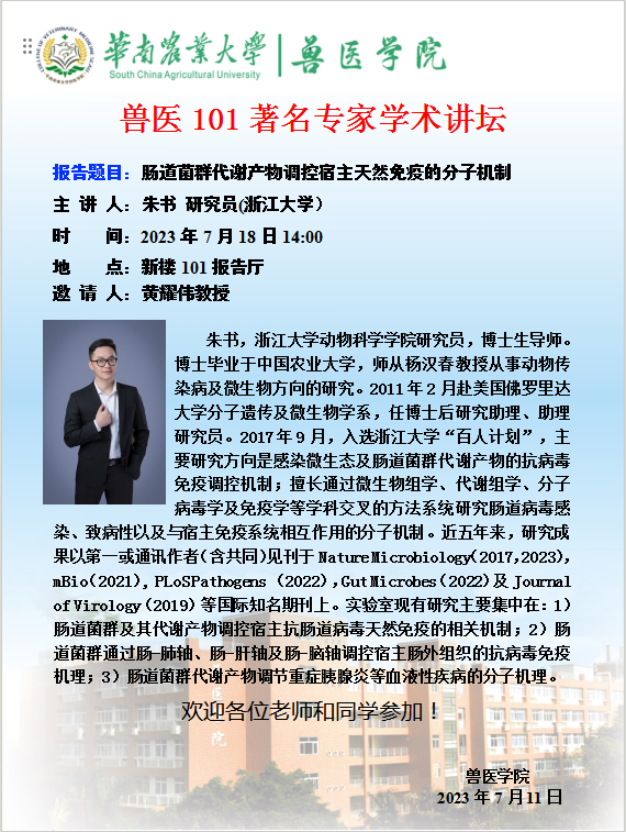 兽医101著名专家学术讲坛--肠道菌群代谢产物调控宿主天然免疫的分子机制