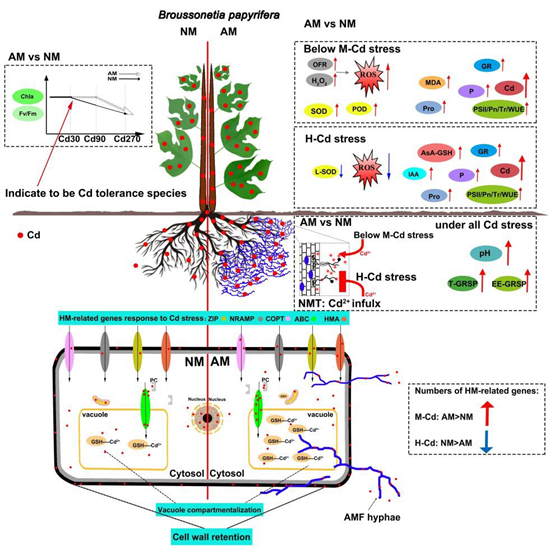 研究发现AM共生改善了构树在低和中等镉胁迫下的生长特性,促进了PSI和PSII反应;通过增强根部CAT、POD和SOD活性,提高了作为应对信号ROS水平,并维持ROS平衡。而高镉胁迫下AM共生促进AsA-GSH循环,减轻ROS过量对植物细胞的损伤;AM真菌菌丝和孢子对镉的螯合作用,改变土壤镉的可利用性,增加土壤GRSP的含量;菌根P吸收途径使更多的镉与叶片中的P结合,并在茎部储存P参与构树茎部的镉解毒。非损伤微测技术研究发现AM真菌增加了中等镉胁迫下根部镉离子的进入和吸收,抑制了高镉胁迫下镉的流入。AM真菌能够上调耐重金属运输相关基因以缓解中等镉胁迫下的镉毒性,并通过其他生理途径将镉毒性降低到中等水平,抑制与重金属运输相关基因的转录。因此,异形根孢囊霉对构树应对镉胁迫的共生效率取决于镉胁迫的程度,在低或中等镉胁迫下,共生效应表现为促进生长、光合性能、镉吸收和相关基因表达、ROS水平和抗氧化酶活性的增强。在高镉胁迫下,共生效应表现为减少镉吸收和相关基因表达、降低ROS水平,以及AM真菌结构和菌根P吸收途径中P补充增强了植物组织对镉的固定以应对高镉胁迫。研究结果为AM真菌介导菌根植物响应重金属胁迫的调控研究提供了新思路。