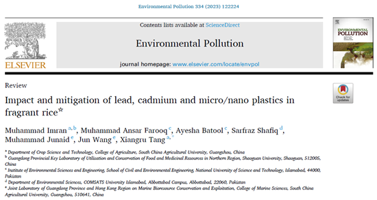 团队在期刊Environmental Pollution发表了题为“Impact and mitigation of lead, cadmium and micro/nano plastics in fragrant rice”的研究论文(论文链接:https://doi.org/10.1016/j.envpol.2023.122224)。本文综述了重金属(铅和隔)和纳米微塑料对香稻产量形成以及2-乙酰基-1-吡咯啉含量的影响以及多种缓解重金属和微塑料胁迫的栽培措施。文章第一作者为农学院博士后Muhammad Imran,通讯作者为唐湘如教授。该研究得到国家自然科学基金(32150410377)和广东省现代农业产业技术体系(2020KJ105)的资助。