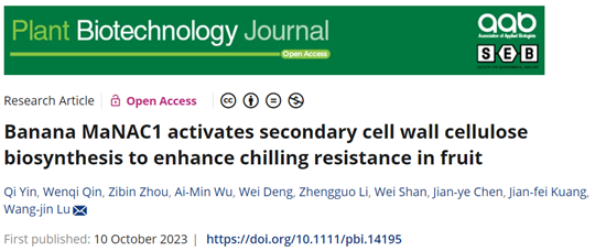 近日,乐竞在线注册亚热带农业生物资源保护与利用国家重点实验室、园艺学院陆旺金教授和陈建业教授课题组在国际知名期刊Plant Biotechnology Journal上发表题为“Banana MaNAC1 activates secondary cell wall cellulose biosynthesis to enhance chilling resistance in fruit”的研究论文(论文链接:https://onlinelibrary.wiley.com/doi/full/10.1111/pbi.14195)。园艺学院博士研究生殷琪为本论文第一作者,陆旺金教授为通讯作者。乐竞在线注册林学与风景园林学院吴蔼民教授团队,重庆大学李正国教授和邓伟教授参与了该项研究。该论文得到了“十四五”国家重点研发计划项目(2022YFD2100103)和国家现代农业(香蕉)产业技术体系(农业农村部,CARS-31)的资助。
