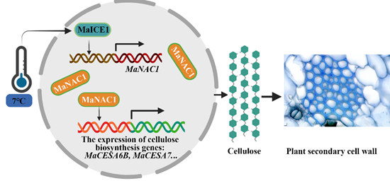 研究人员发现,冷害增加香蕉果皮维管组织细胞壁厚度及纤维素葡聚糖含量(图1)。与对照果实相比,低温下贮藏5天的香蕉果皮硬度增加,维管组织细胞壁增厚,并且纤维素葡聚糖的含量升高。从香蕉果实中筛选获得了一个受低温上调的次生细胞壁相关的NAC(Secondary Cell Wall-associated NAC,SWN)同源基因MaNAC1,明确其参与低温下香蕉果实的纤维素合成。通过分析低温下香蕉果皮纤维素合酶基因的表达发现,冷害上调了香蕉果皮中编码纤维素合酶的基因MaCESA6A、MaCESA6B、MaCESA6F、MaCESA7和MaCESA8的表达量。凝胶阻滞(EMSA)分析和转录激活实验进一步明确了MaNAC1能够直接结合在纤维素合酶MaCESA6B和MaCESA7启动子中的SNBE位点,并激活它们的转录。将MaNAC1稳定过量表达到拟南芥野生型和snd3突变体中进行功能分析,发现在低温胁迫下,MaNAC1植株花序茎增高、细胞壁增厚、纤维素葡聚糖含量升高以及AtCESAs基因表达上调。在番茄果实中稳定过量表达MaNAC1进行功能分析,发现番茄果实SlCESAs的表达上调、纤维素积累、细胞壁增厚和耐冷性增强。根据以上研究结果,提出了MaNAC1参与调控香蕉果实冷害的工作模型(图2):MaNAC1响应低温上调了MaCESA6B和MaCESA7表达,最终促进香蕉细胞壁纤维素合成;同时,在番茄中过表达MaNAC1增强了番茄果实对低温的耐受性,也印证了这一结论。