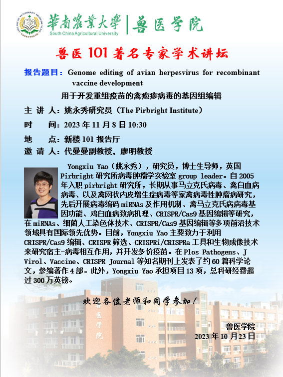 兽医101著名专家学术讲坛--Genome editing of avian herpesvirus for recombinant vaccine development
