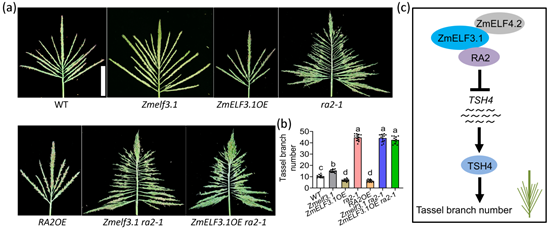 花序大小是作物的重要农艺性状,不仅影响植株繁殖成功与否,还决定作物产量。玉米是雌雄同株异花作物,其雄性花序(雄穗)位于植物顶部。雄穗分枝数目、总穗长和穗分枝角度与玉米产量有着复杂的关系,是玉米遗传育种的重要靶标性状。太小的雄穗无法产生足够花粉以维持自交系和杂交生产,太大的雄穗不仅降低了植株上部叶片的截光能力,还不利于光合同化物向籽粒分配。目前对于玉米雄穗分枝数(Tassel branch number,TBN)的分子调控机制仍然不清楚。该团队前期研究发现,ZmELF3能与ZmELF4和ZmLUX相互作用形成晚间复合体,直接抑制几个开花抑制子表达,从而促进玉米的开花和玉米由热带向温带扩张的适应性(Zhao et al., 2023, The Plant Cell)。在本研究中,研究人员发现ZmELF3.1的功能缺失突变体雄穗分枝数显著增加,雄穗分枝数负调控因子RA2能直接与正调控因子TSH4(ZmSPL2)的启动子结合并抑制其表达,从而导致雄穗分枝数减少。进一步研究发现,ZmELF3.1蛋白直接与RA2和ZmELF4.2蛋白相互作用,形成蛋白复合物,增强了RA2对TSH4启动子的结合和抑制作用,导致雄穗分枝数显著降低。该研究首次揭示了一个新的ELF3-ELF4-RA2蛋白复合体调控玉米雄穗分枝数的分子机理,并为玉米雄穗分枝数的遗传改良提供了一个潜在的基因资源。