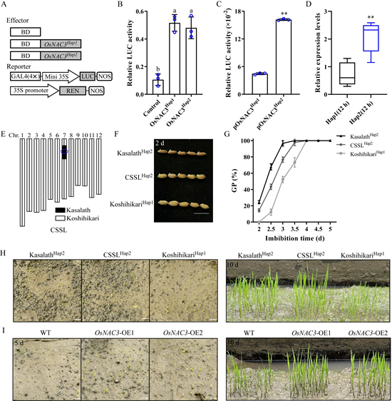 本研究在前期水稻种子萌发转录组数据中,挖掘和鉴定到转录因子OsNAC3是一个调控种子萌发的关键因子,该基因正调控种子萌发。分子机制研究表明,在种子萌发过程中,OsNAC3可以直接与ABA分解代谢基因OsABA8ox1和细胞延长基因OsEXP4的启动子结合,从而激活它们的表达;同时,研究发现OsNAC3通过直接影响OsEXP4表达和间接影响ABA介导的OsEXP4表达,决定胚细胞伸长,从而调节种子萌发。基因单倍型分析表明,优异单倍型Hap2主要分布在籼稻中,将籼稻的优异单倍型导入到粳稻中,或在粳稻中过表达OsNAC3基因,能有效提高田间直播条件下粳稻种子发芽和后期幼苗生长。