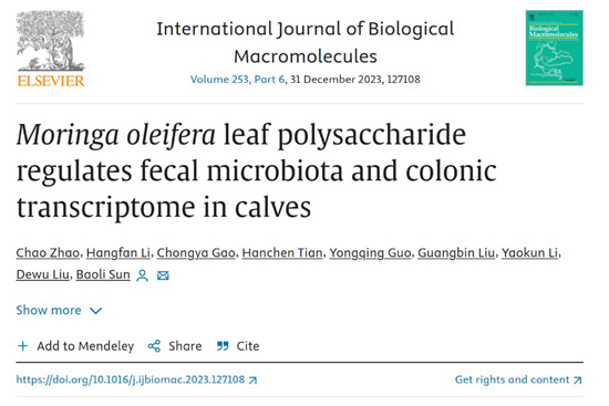 近日,乐竞在线注册动物科学学院孙宝丽教授团队在国际学术期刊International Journal of Biological Macromolecules(中科院一区Top期刊,影响因子8.2)发表了题目为“Moringa oleifera leaf polysaccharide regulates fecal microbiota and colonic transcriptome in calves”的研究论文(论文链接:https://www.sciencedirect.com/science/article/pii/S0141813023040059),该论文发现辣木多糖(MOP)可提高犊牛日增重,降低犊牛腹泻率,促进肠道益生菌生长,并阐明了发挥作用的关键基因及其预防犊牛腹泻的作用机制。