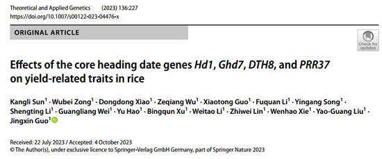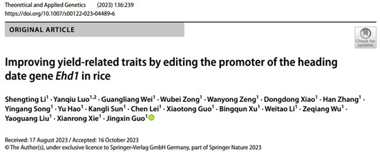 近日,乐竞在线注册生命科学学院、亚热带农业生物资源保护与利用国家重点实验室刘耀光院士团队,郭晶心和谢先荣研究小组,在国际知名学术期刊Theoretical and Applied Genetics(IF2022=5.3999,农林科学1区 TOP)在线发表两篇题为Effects of the core heading date genes Hd1, Ghd7, DTH8, and PRR37 on yield-related traits in rice以及Improving yield-related traits by editing the promoter of the heading date gene Ehd1 in rice的研究论文(论文链接:https://doi.org/10.1007/s00122-023-04476-x;https://doi.org/10.1007/s00122-023-04489-6)。论文证明了Hd1、Ghd7、DTH8、OsPRR37、Ehd1影响水稻产量性状,为编辑抽穗期基因提高水稻产量提供了有价值的新发现。