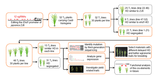 论文二在粳稻中嘉8号通过多靶点编辑Ehd1启动子,结合三代高通量测序技术在T2代获得类型多样的突变纯合株系,从中筛选无T-DNA插入、Ehd1表达量不同程度降低、抽穗期略延迟,产量性状及稻米品质提高的材料,为培育优异水稻品种的系列抽穗期衍生品系提供了有效的育种策略。博士生李盛婷和硕士生罗燕秋为共同第一作者。