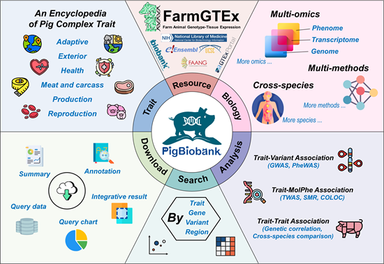 精准解析猪复杂性状对了解动物复杂性状遗传调控机制和提高猪群生产性能意义重大。然而,当前以猪复杂性状为核心的综合性数据库匮乏,极大地限制了不同领域科学家对猪复杂性状遗传机制的深入探索。为帮助更多领域科学家精准解析猪复杂性状,作为FarmGTEx国际畜禽动物研究计划PigGTEx联盟的系列工作之一, PigBiobank收集了来自全球71, 885头猪的264个复杂性状全基因组关联分析(GWAS)结果、PigGTEx项目产生的猪34个组织5类分子数量基因座(molQTLs)结果、Ensembl等多种来源的猪多组学数据以及UKB等跨物种复杂性状数据,并对这些大数据资源进行统一的整合分析和可视化,进而形成了以猪复杂性状为核心的综合性数据库 PigBiobank (http://pigbiobank.farmgtex.org/)。